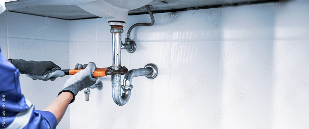 Technician plumber using a wrench to repair a water pipe under the sink. Concept of maintenance, fix water plumbing leaks, replace the kitchen sink drain, cleaning clogged pipes is dirty or rusty.