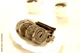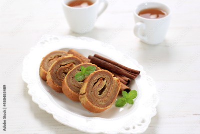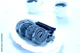 Homemade Small Mini Lapis Legit Roll, Delicious Traditional Cake from Indonesia with Spice and Cinnamon. White Background and White Plate.