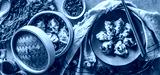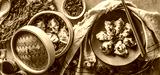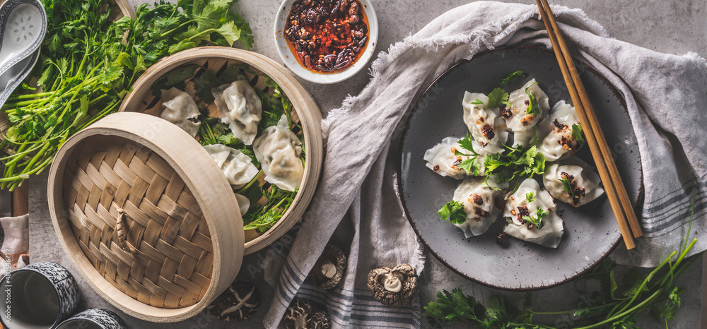 Tasty dumplings in steaming basket and on plate with chopsticks herbs and dips. Asian food. Top view.