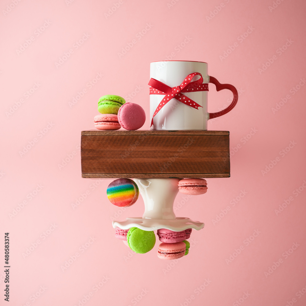 Valentines day creative concept with coffee cup and macaroons dessert over pink background
