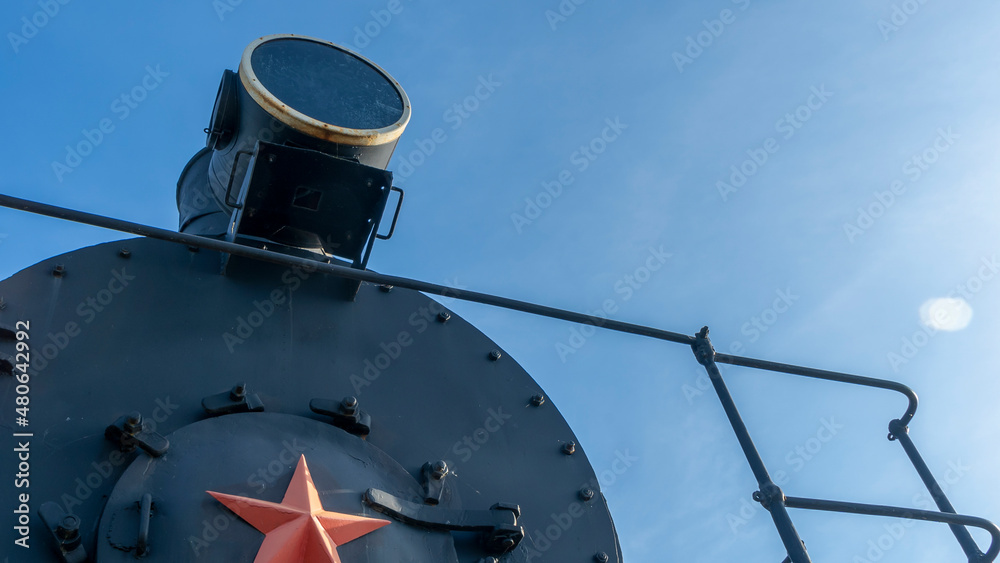 The old spotlight of the Soviet locomotive of the early 20th century. Retro light in front part of train.