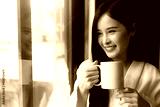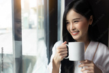Close up beautiful young woman drinking coffee Looking through window Morning coffee is her daily routine Happy young female with cup of tea or hot coffee Beauty girl drinking coffee at home or hotel