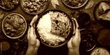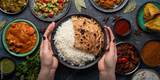 Assorted Indian ethnic food buffet on rustic concrete table from above: curry, fried samosa, rice biryani, dal, paneer, chapatti, naan, chicken tikka masala, traditional dishes of India for dinner