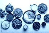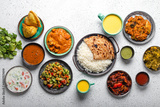 Indian ethnic food buffet on white concrete table from above: curry, samosa, rice biryani, dal, paneer, chapatti, naan, chicken tikka masala, mango lassi, dishes of India for dinner background