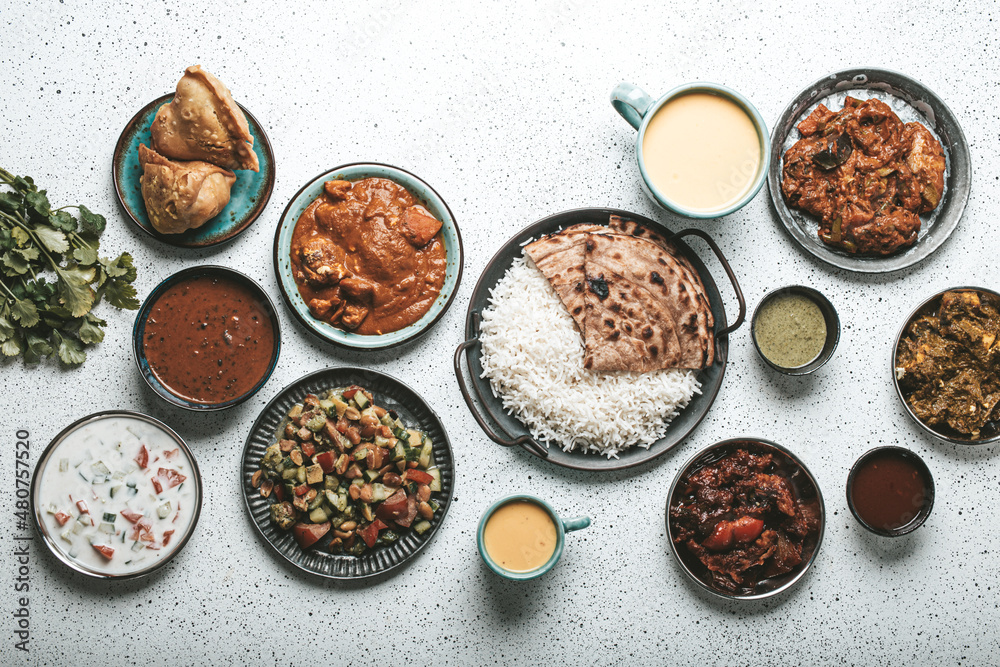Indian ethnic food buffet on white concrete table from above: curry, samosa, rice biryani, dal, paneer, chapatti, naan, chicken tikka masala, mango lassi, dishes of India for dinner background