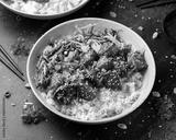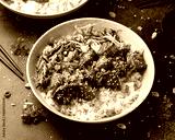 Vegan fried tempeh with rice and vegetables. Asian healthy food