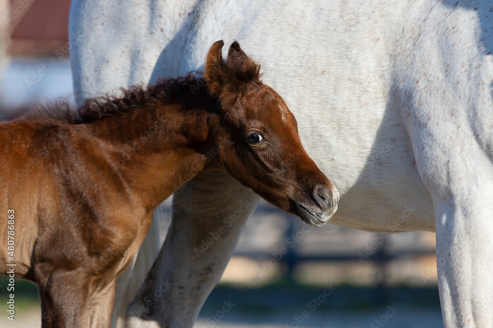 Young pretty arabian horse foal and his mother on summer background, portrait closeup