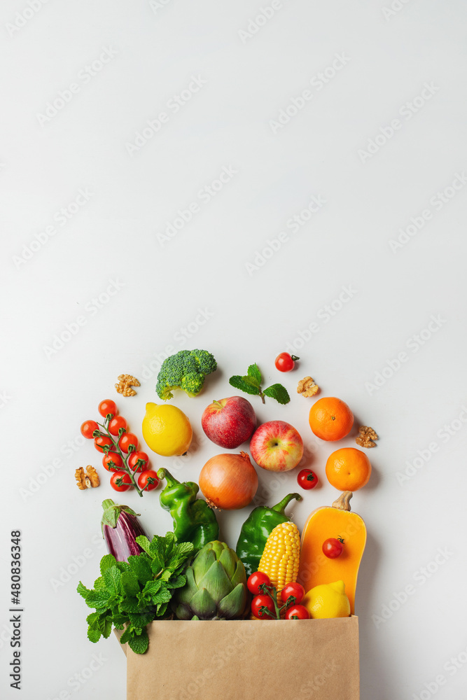 Delivery healthy food background. Healthy vegan vegetarian food in paper bag vegetables and fruits on white, copy space, banner. Shopping food supermarket and clean vegan eating concept
