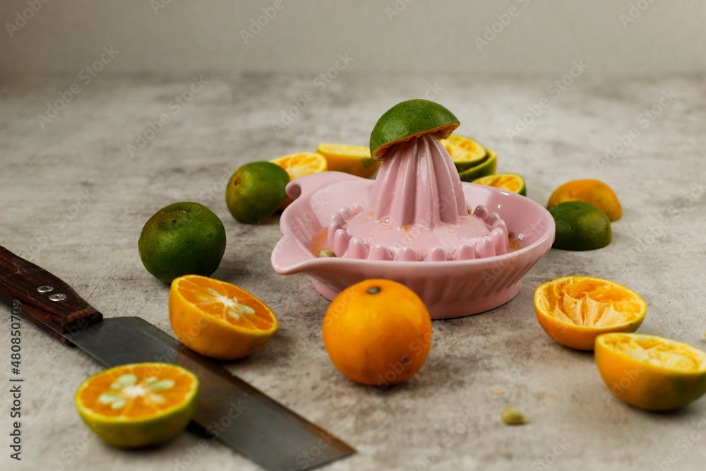 Squeezing Juice from Orange on a Manual Ceramic Squeezer.