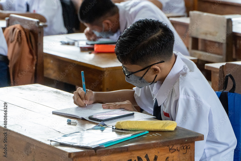 BALI,INDONESIA-5 OCT 2021: classroom atmosphere in Indonesian junior high schools when learning the new normal. Students are seen wearing health masks when studying in class