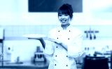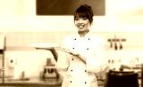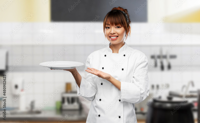 cooking, culinary and people concept - happy smiling female chef holding empty plate over restaurant kitchen background