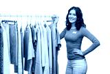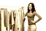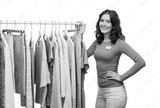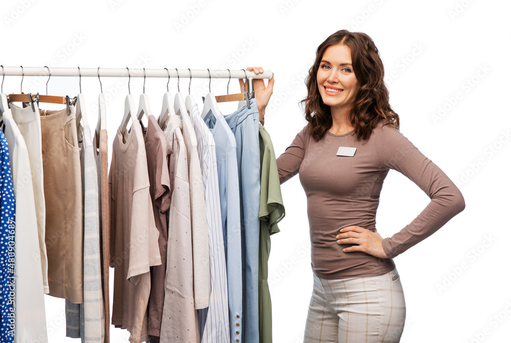 sale, shopping and business concept - happy female shop assistant or saleswoman with clothes on hanger over white background