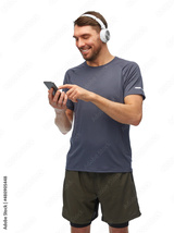 fitness, sport and healthy lifestyle concept - smiling man in sports clothes with smartphone and headphones listening to music over white background
