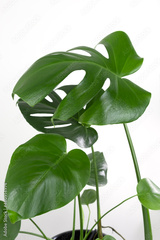 Beautiful home flower monstera deliciosa or Swiss cheese plant on a white background. Large leaves of the Monstera house plant. Selective focus.