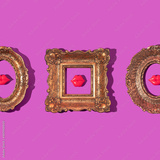 Valentines day creative pattern with red lips figurines and vintage painting frames on bright purple background. 80s, 90s retro romantic aesthetic kiss concept. Minimal surreal fashion idea.