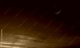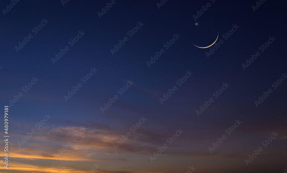 crescent moon and star on dusk sky twilight background, religion of Islamic Ramadan Kareem, Eid al Adha, Eid al fitr