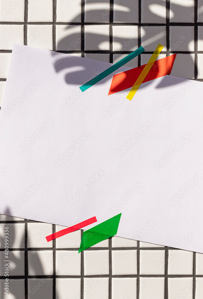 White paper frame with colorful scotch tapes and tropical leaves shadows on the ceramic tile table. Copy space