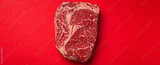 Raw meat beef prime cut steak Ribeye on clean red background from above, beefsteak concept banner minimalism with space for text