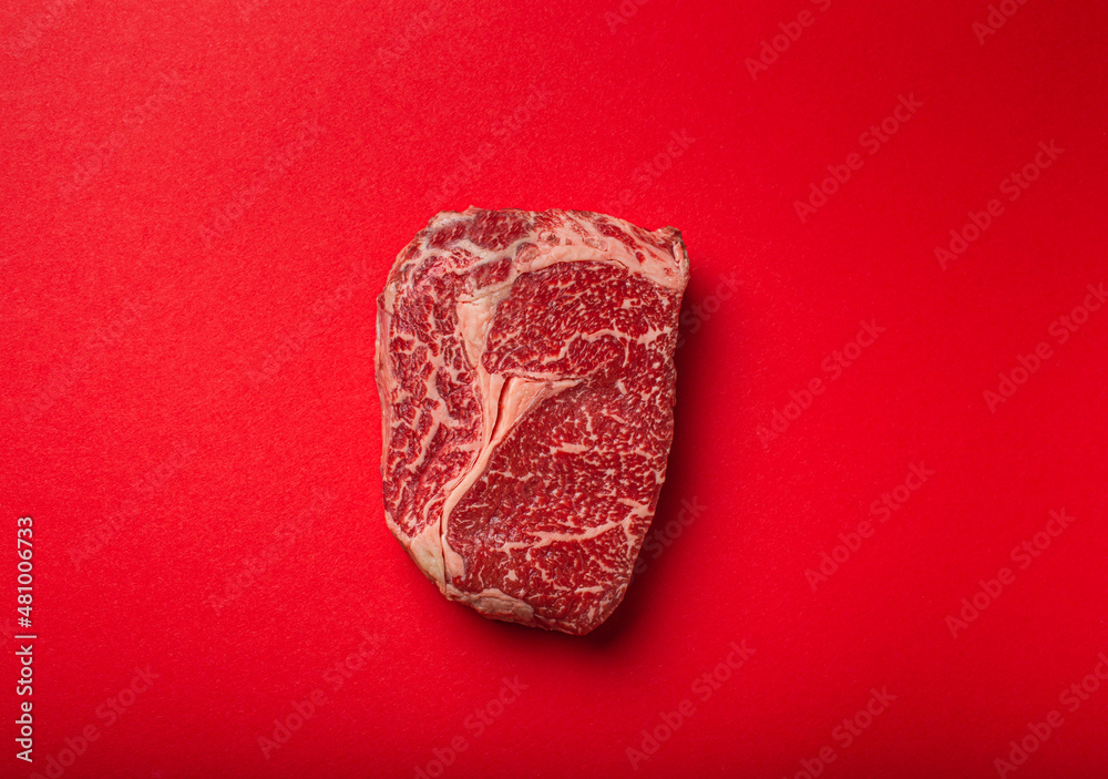 Raw meat beef prime cut steak Ribeye on clean red background from above, beefsteak concept banner minimalism with space for text