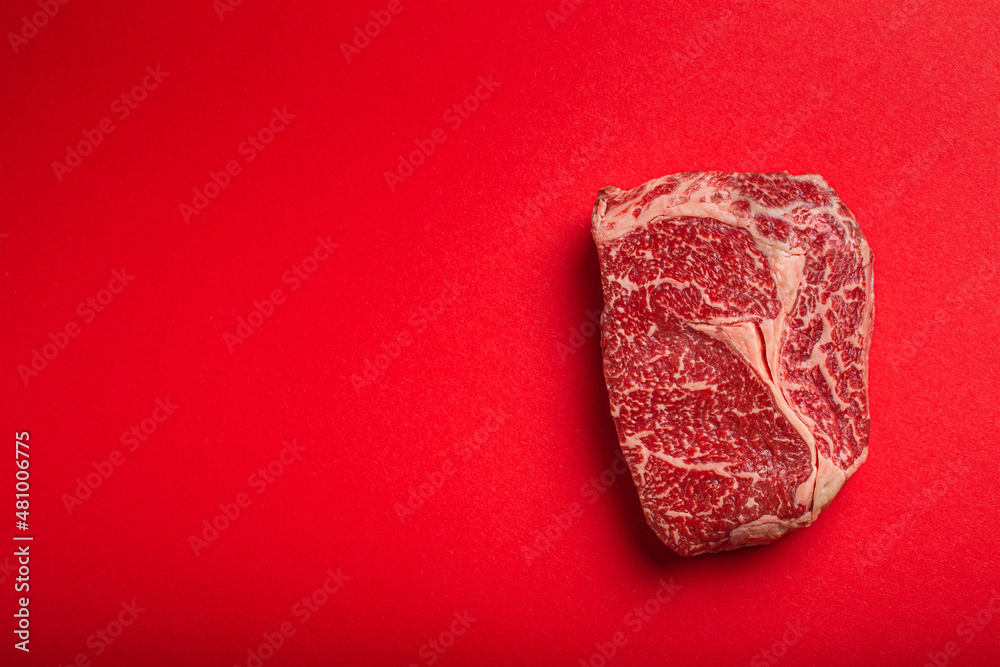 Raw meat beef prime cut steak Ribeye on clean red background from above, beefsteak concept banner minimalism with space for text