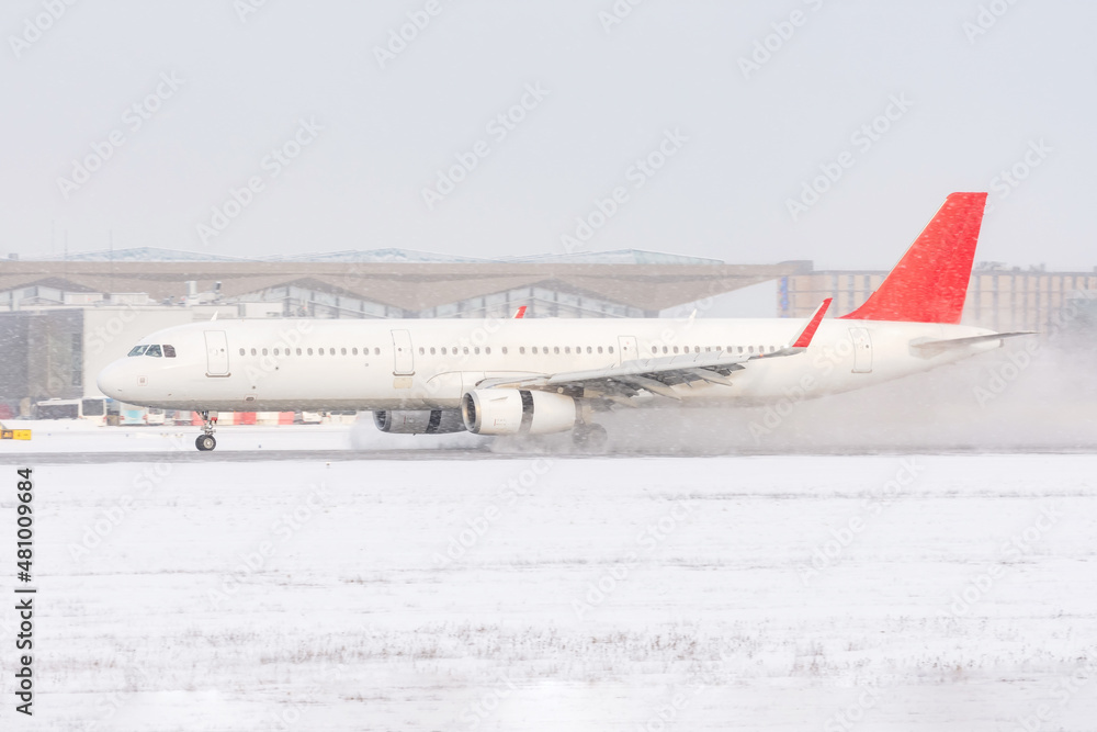 Landing aircraft reverse engines during a snowstorm and poor visibility.