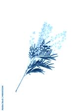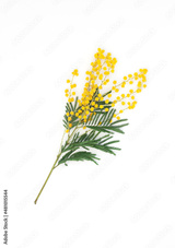 Fresh yellow mimosa branch on the white background. Top view