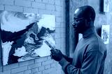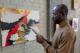 Serious African man with art guide leaflet standing in front of white brick wall with abstract painting of modern artist