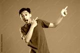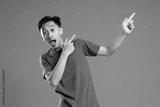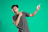Portrait of a happy young man in white t-shirt pointing fingers away at copy space isolated over green background