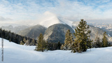 Fantastic winter landscape with snowy trees and snowy peaks. Carpathian mountains, Ukraine. Christmas holiday background. Landscape photography