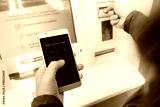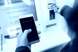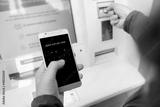 Person using mobile phone with verification code at an ATM. Security concept for authentication by phone.