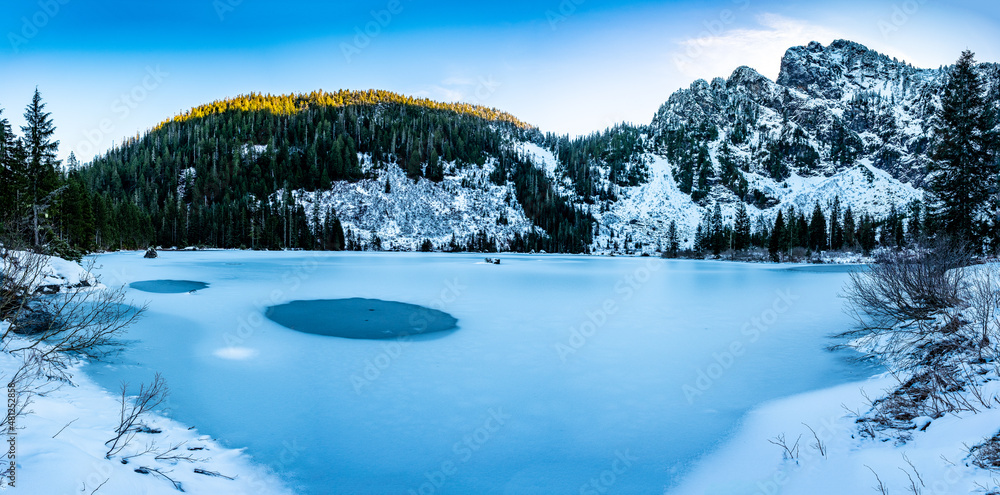 A panoramic view of a snow and ice covered Lake Heather with snow covered trees and hills in the background