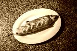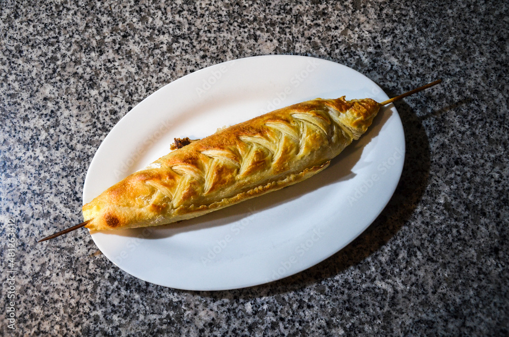 Traditional Georgian dish Khachapuri with cheese on a skewer fried on the grill served on white plate