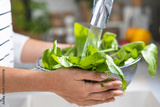 Young woman washing green arugula salad greens in colander by kitchen sink