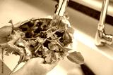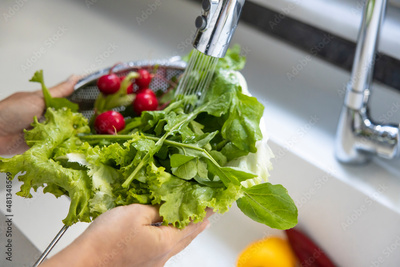 Young woman washing green arugula salad greens in colander by kitchen sink