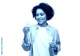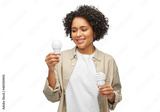 eco living, energy saving and sustainability concept - portrait of happy smiling woman comparing lighting bulbs over white background
