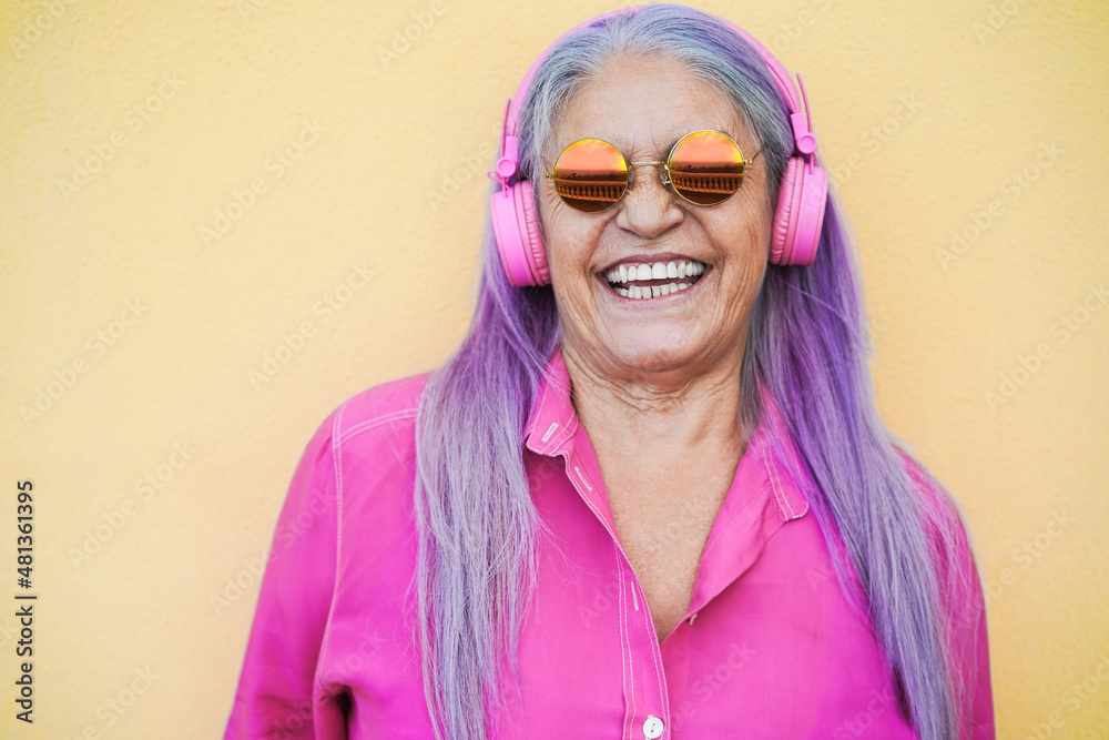 Happy senior woman listening to playlist music with headphones - Focus on face