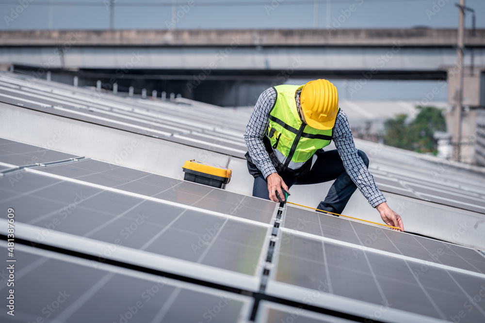 Engineer wearing unifrom and helmet inspect and check solar cell panel ,solar cell is ecology energy sunlight power installation for industrail ,alternative environment power concept.