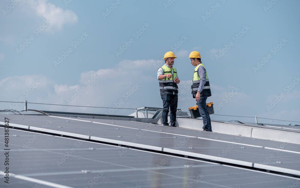 Engineer wearing unifrom and helmet inspect and check solar cell panel ,solar cell is ecology energy sunlight power installation for industrail ,alternative environment power concept.