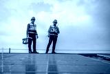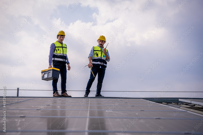 Engineer wearing unifrom and helmet inspect and check solar cell panel ,solar cell is ecology energy sunlight power installation for industrail ,alternative environment power concept.