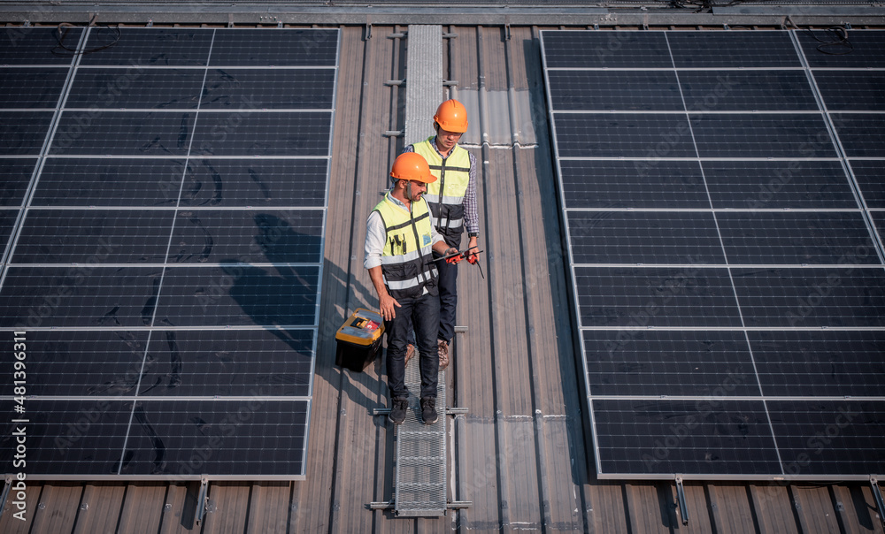 Engineer wearing unifrom and helmet inspect and check solar cell panel ,solar cell is ecology energy sunlight power installation for industrail ,alternative environment power concept.
