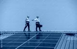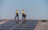 Engineer wearing unifrom and helmet inspect and check solar cell panel ,solar cell is ecology energy sunlight power installation for industrail ,alternative environment power concept.