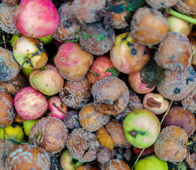 Close-up view of bunch of rotten apples.