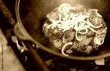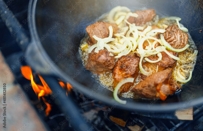 Meat is cooked in cauldron on fire. Step by step cooking of Pilaf.