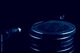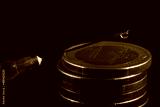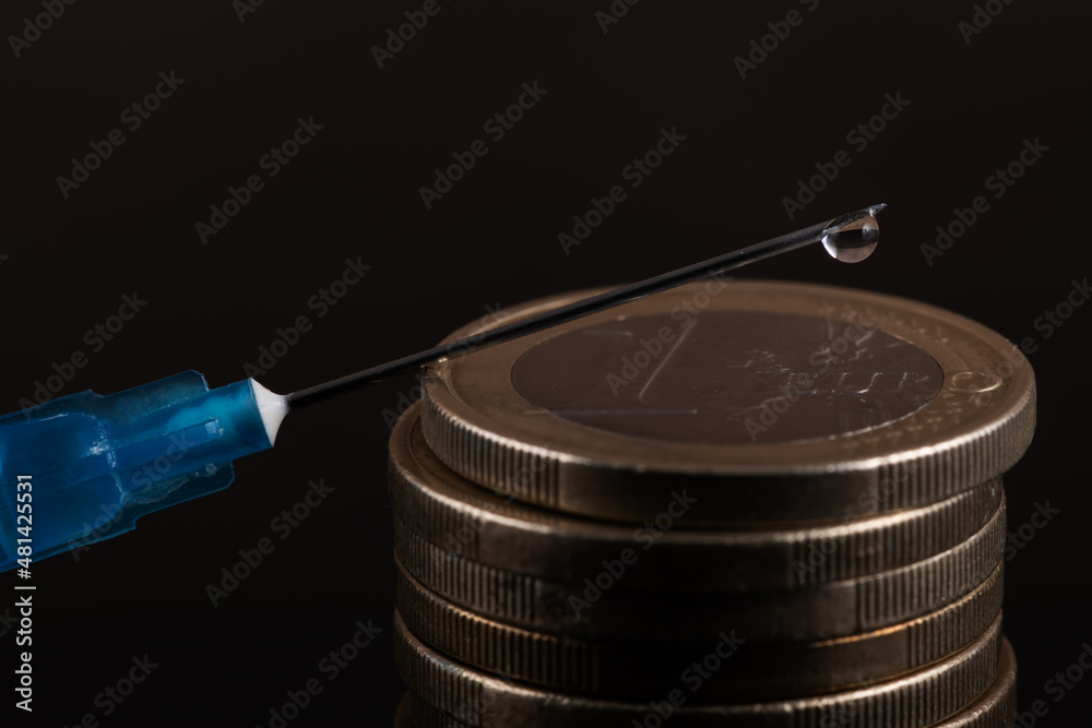 Syringe with a drop of liquid on the tip of the needle and a coin in denominations of 1 euro