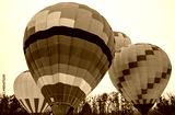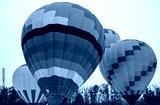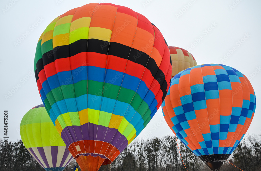 A group of multicolored hot air balloons before take-off over the surroundings