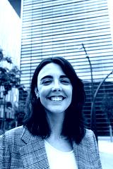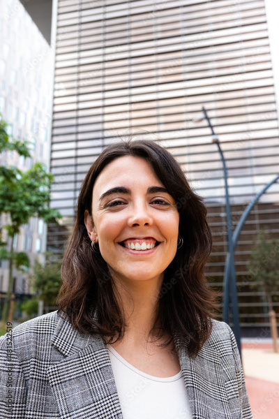 Vertical portrait of young business woman looking at camera next to office buildings. Copy space.