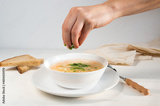 A plate of chicken noodle soup on a light background. The concept of home healthy food.