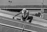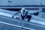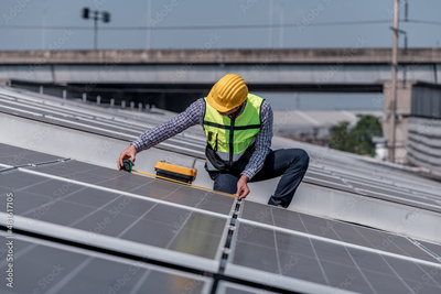 Engineer wearing unifrom and helmet inspect and check solar cell panel ,solar cell is ecology energy sunlight power installation for industrial ,alternative environment power concept.