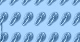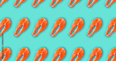 Minimalist pattern made of raw fresh fish salmon steak top view on blue clean background from above, delicacy healthy fish eating and nutrition concept flat lay