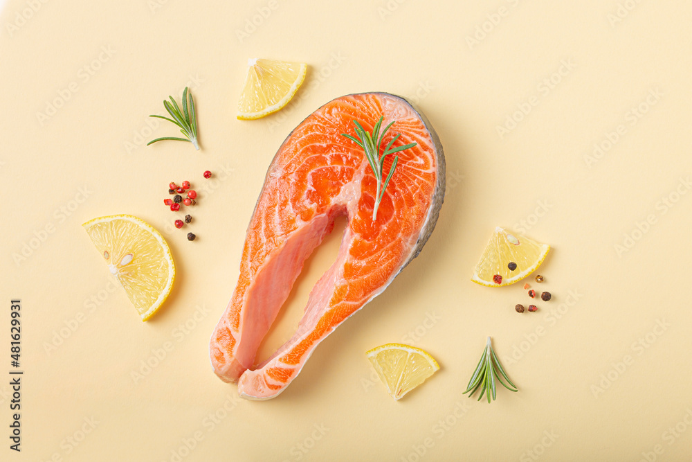 Uncooked raw fresh fish salmon steak top view on beige pastel background with rosemary, lemon wedges and spices, delicacy healthy fish cooking and nutrition concept flat lay